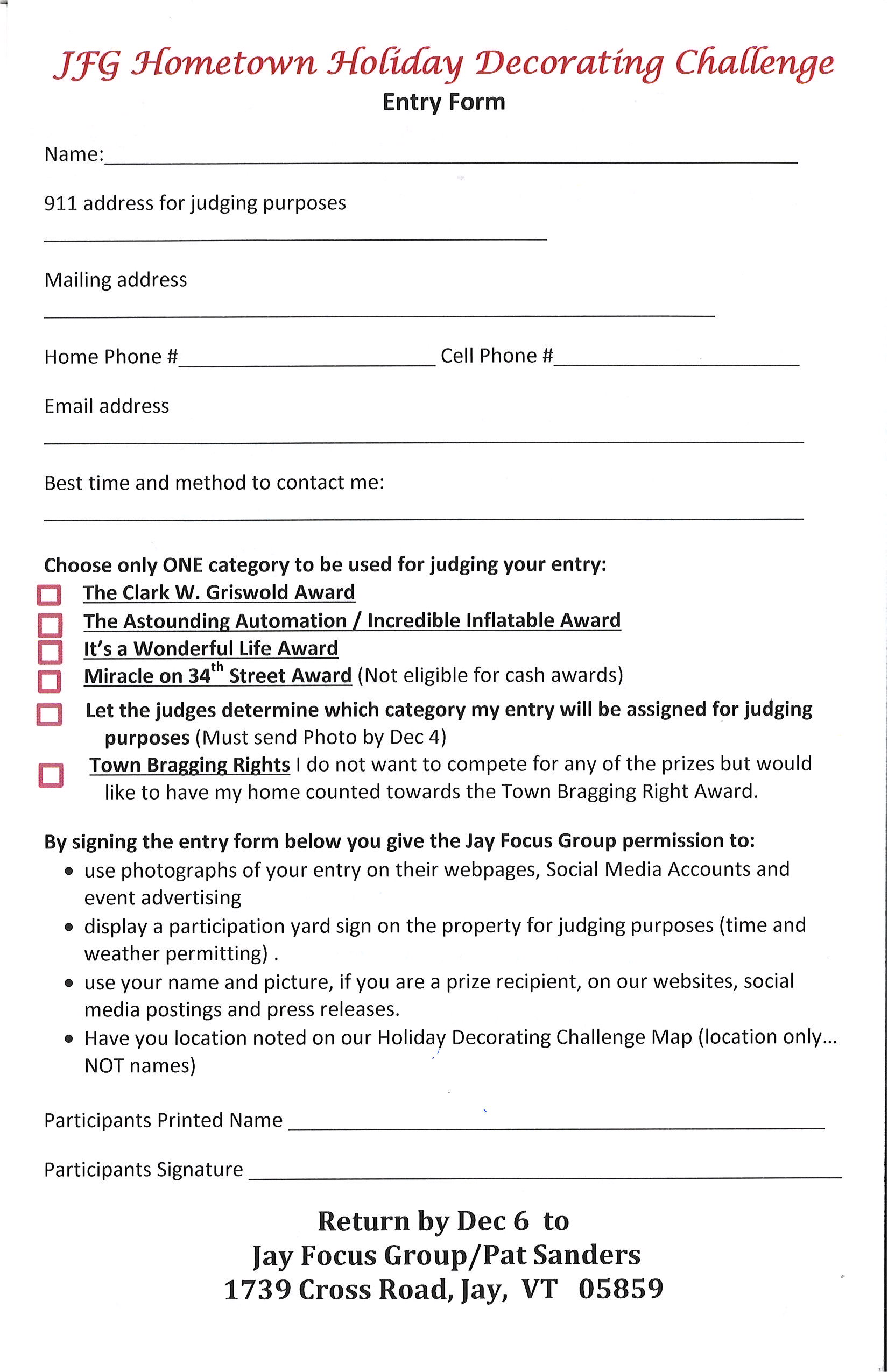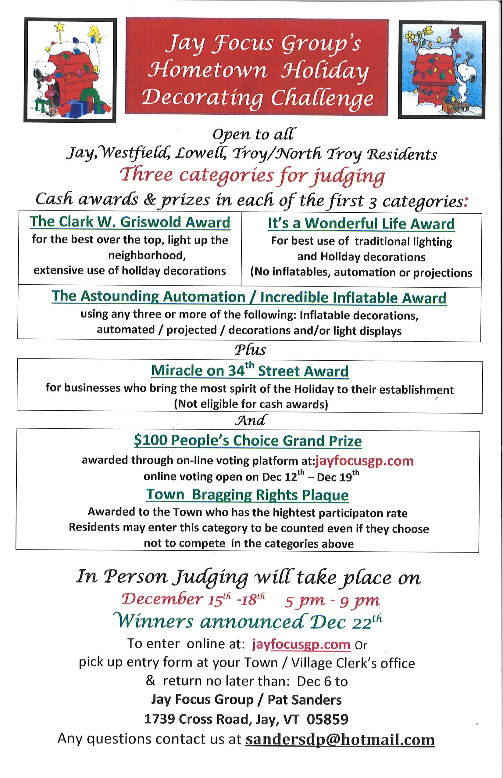 The Hometown Holiday Decorating Challenge is hosted by the Jay Focus Group and open to all residents of Westfield, Jay, Lowell, Troy and North Troy. Entry forms are due no later than December 6th, 2025. Online voting for the Grand Prize Award of $100 will take place between December 12th and December 19th. Lights and displays must remain lit between the hours of 5-9PM starting December 12th until December 25th. Prize winners will be announced on December 22nd.